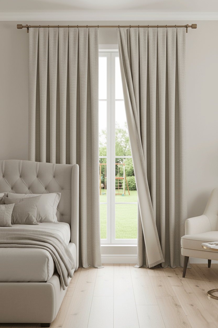 Çift Yüzey Lüksü: Dış yüzeyindeki doğal bej keten dokunun sıcaklığı, iç yüzeyindeki bir ton koyu, pürüzsüz ipeksi astarın zarifliğiyle buluşuyor. Nuvet, perdenizi her açtığınızda hem görsel bir şölen sunar hem de iç mekana sofistike bir dokunuş katar.